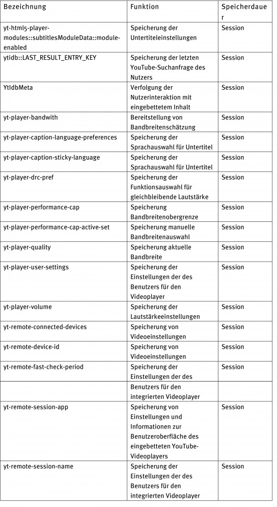 Sobald Sie die Einwilligung zum Nachladen von YouTube-Videos erteilt haben, werden zum Zwecke der Bereitstellung des Dienstes, der Speicherung von Einstellungen und der Wiedergabe von Multimedia-Inhalten bestimmte Informationen im Local Storage/Indexed DB/Session Storage Ihres Webbrowsers gespeichert. Die Speicherung dieser Informationen ist für die ausgewählte Funktion der Video-Wiedergabe i.S.d. § 25 Abs. 2 Nr. 2 TDDDG unbedingt erforderlich. Über die gespeicherten Funktionen informieren wir Sie wie folgt: